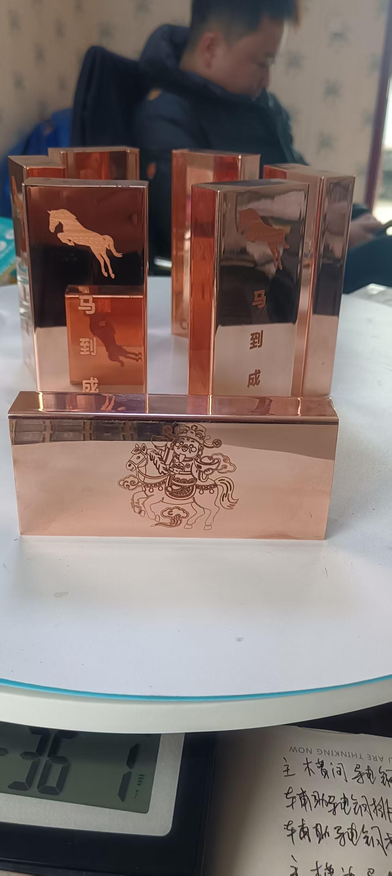 純紫銅打造工藝品擺件,具有較好的(de)收藏價值,可以根據不同需求在銅塊表麵製作各種圖片和文字,最近比較火的有,一馬當先,逢考必過,馬到(dào)成功等美好寓意的文字(zì),也可以(yǐ)製作圖片,個人美照永久保存!